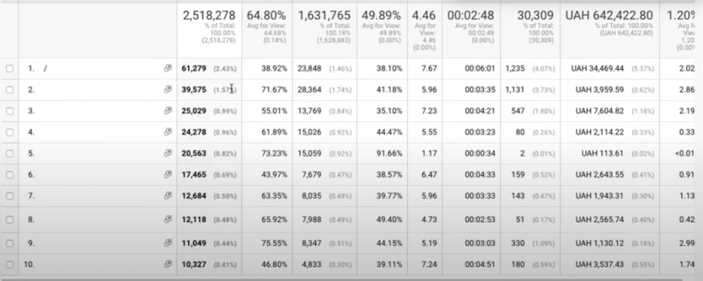 Тобто ви можете побачити, на цьому прикладі головна сторінка переглядається 61 279 одиниць потенційних людей, але нових не так вже й багато менш як 40 % і вони себе поводять зовсім по іншому, ніж ті, що прийшли перший раз ( 73-75%). І якщо взяти загальне значення усієї кількості сесій це досить не багато. В деяких випадках це може бути 1%, в деяких 5%, тобто не всі заходять на головну сторінку і її варто аналізувати окремо.