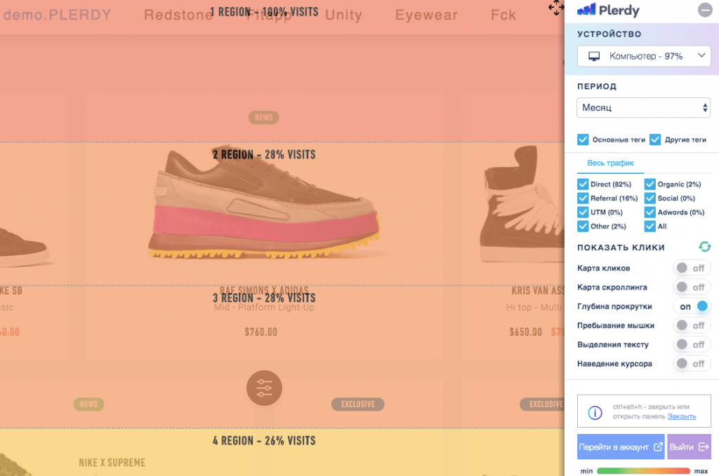 Ось наприклад на вашому сайті після встановлення скрипта зображаються всі кліки, повністю у динамічному вигляді. Вони завантажуються на елементах, які у вас є на сайті та на основі цього можна шукати дуже цікаві інсайти, дуже цікаві поведінкові фактори, такі як люди себе ведуть на цих сторінках, які користуються тими елементами. Куди вони можуть дійсно скролити? Як глибоко вони можуть заходити? І які де групи кліків знаходяться? Це на стільки круто, що ви побачите скільки є інсайтів, що ви будете шоковані.