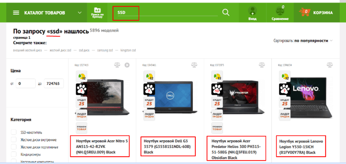 Не повинно виникати проблем при введенні запиту на товар у пошуку. Повинна бути чітка логічна послідовність. Наочним прикладом можна побачити, вбиваючи у пошук SSD чомусь вибили ноутбуки, хоча першими обов’язково бути SSD накопичувач. Пріоритет не правильний. Має бути чітко послідовність логічна.